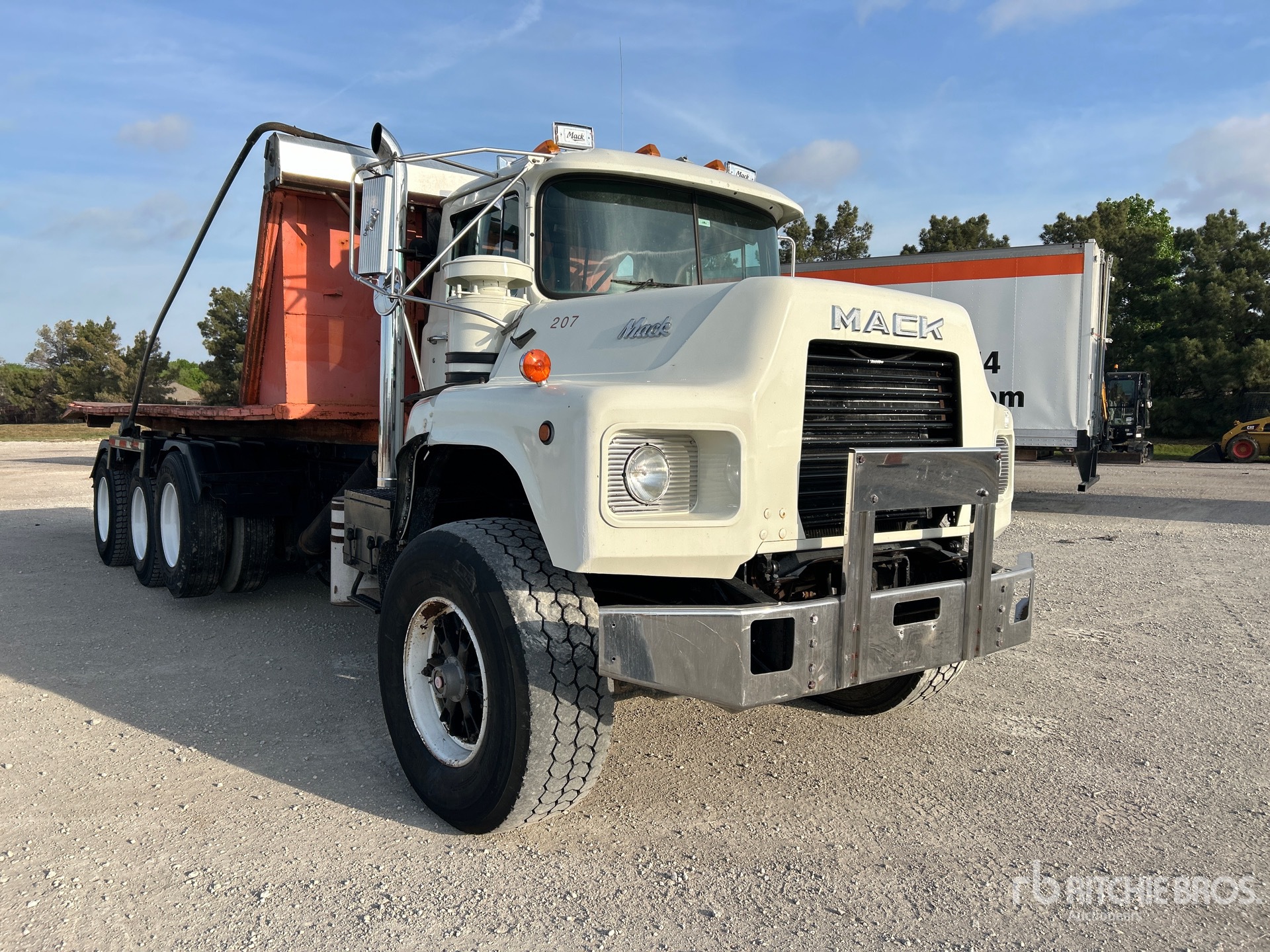 Located in Lane 48 Spot 10, Mack EM7-300 6 Cylinder Diesel 300 hp Engine, 1991 US EPA Label, Manual Transmission, 18100 lb Front Axle, 42400 lb Rears, 60500 lb GVWR, 425/65R22.5 Front Tires, 11R22.5 Rear Tires, Air Lift Pusher Axle, Double Frame, Camelback Spring Suspension, 242 in Wheelbase, PTO, 1991 Galbreath UT-EX-174 Roll-Off Body, 23 ft Hoist, Winch