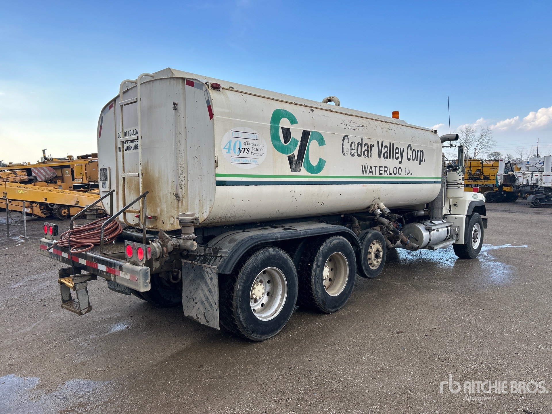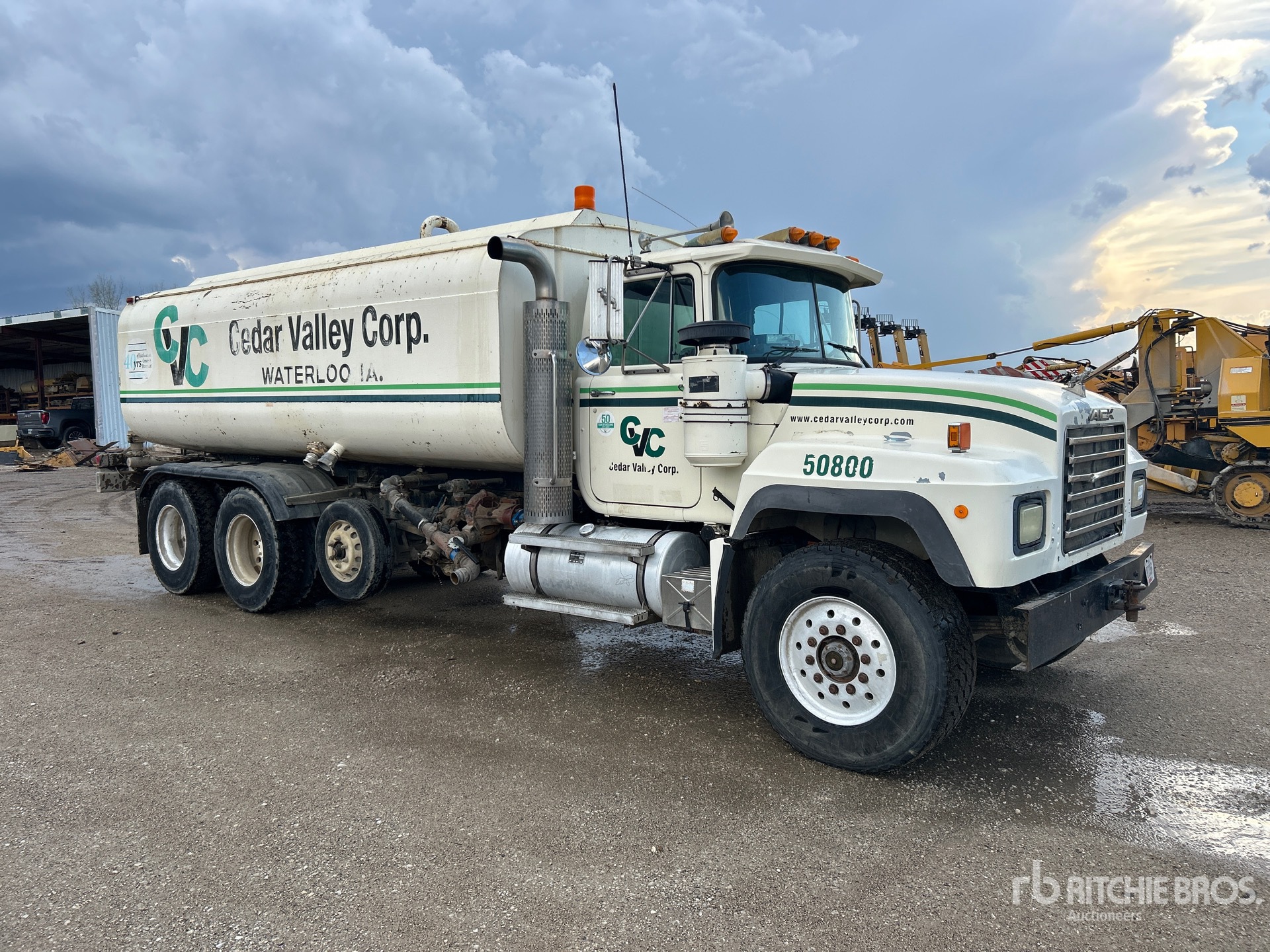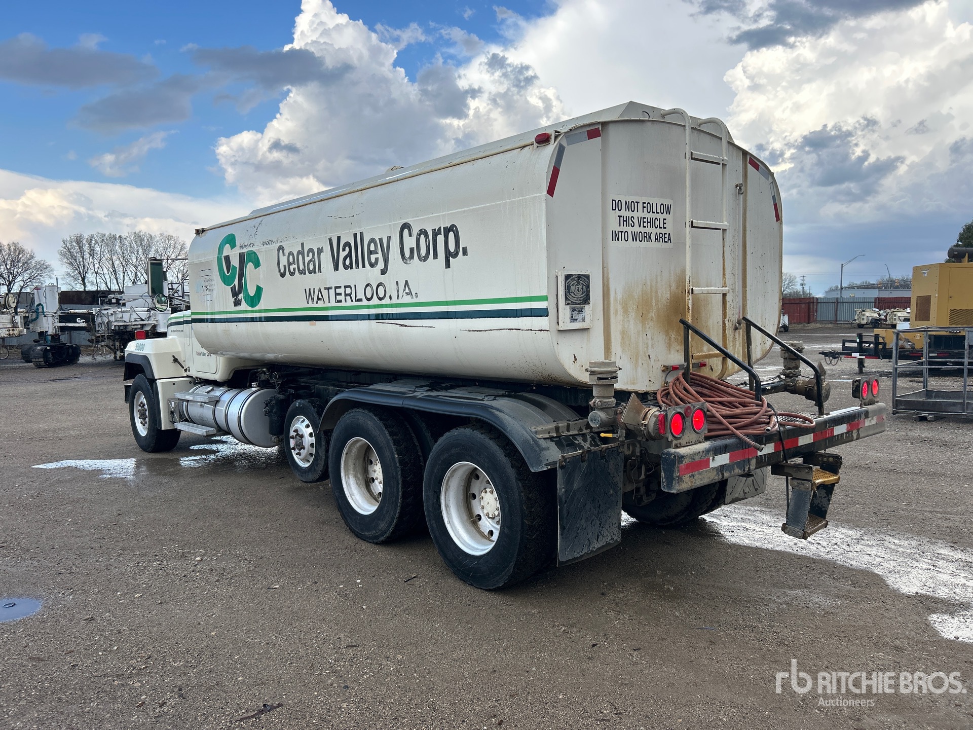 Mack EM7 6 Cylinder 728 cid Diesel 300 hp Engine, 1993 US EPA Label, 29855 Engine hrs, Manual Transmission, Aluminum Wheels, 385/65R22.5 Front Tires, 11R22.5 Rear Tires, Air Lift Pusher Axle, Spring Suspension, 236 in Wheelbase, PTO, 5000 gal Steel Tank, Hydraulic Driven Pump, 7 ft, Spray Bar, Rear Spray, Street Flusher