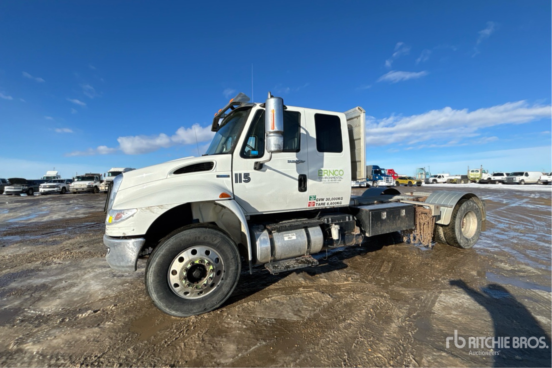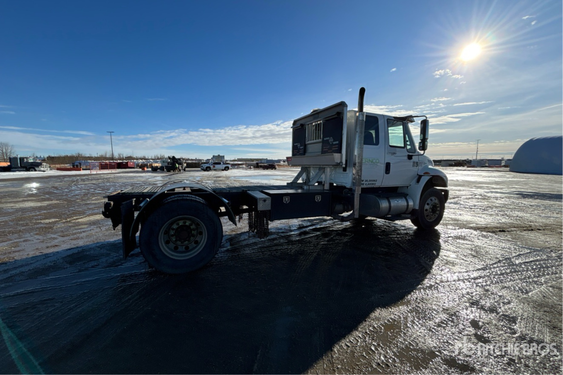 International Maxxforce 9 310 hp Engine, Engine Coolant Heater, 2008 US EPA Label, 7740 Engine hrs, Eaton Fuller 10-Speed Manual Transmission, 12000 lb Front Axle, 23000 lb Rears, 35000 lb GVWR, Engine Brake, Differential Lock, 232 in Wheelbase, Air Suspension, Aluminum Wheels, 11R22.5, Dual Fuel Tanks, Headache Rack