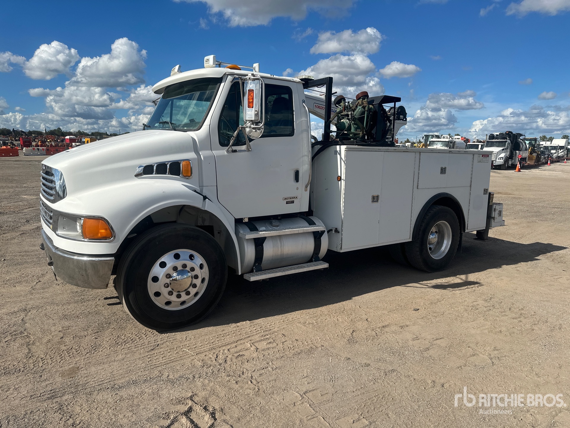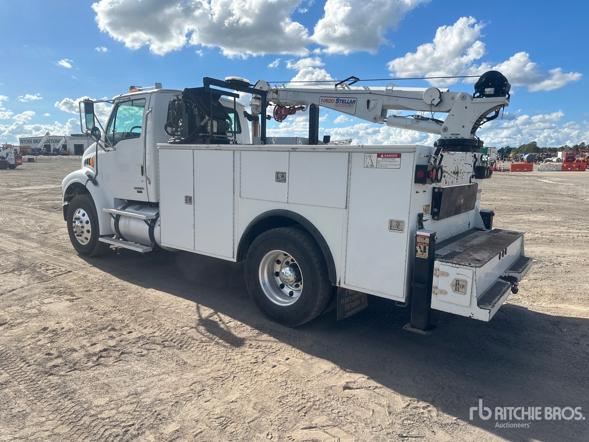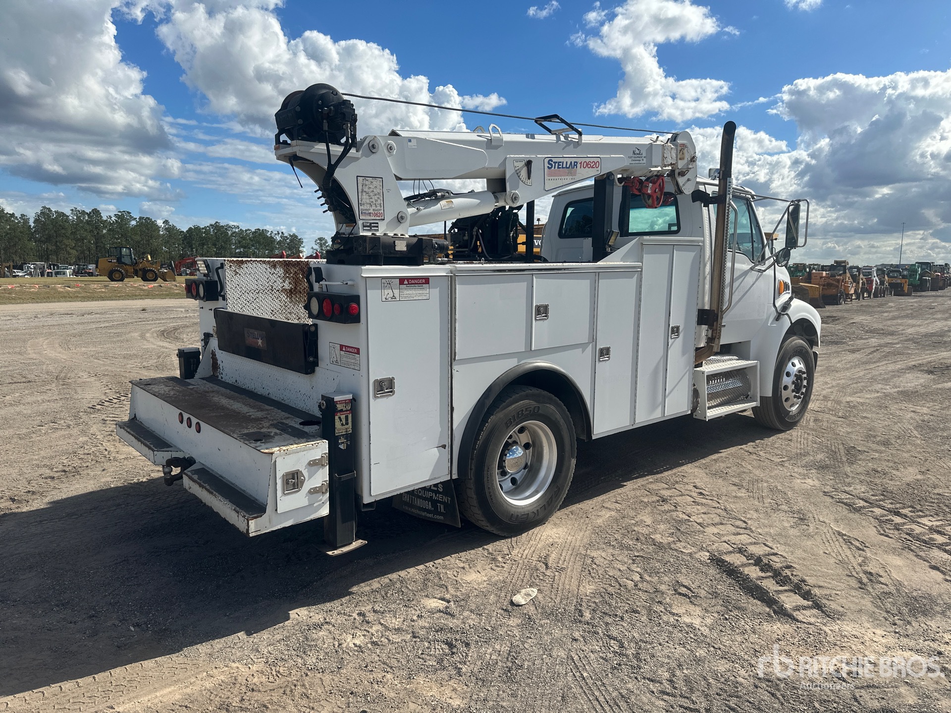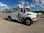 Detroit 7.2 L Diesel 350 hp Engine, 2008 US EPA Label, 19836 Engine hrs, Engine Brake, 6-Speed Manual Transmission, Differential Lock, 10000 lb Front Axle, 17500 lb Rears, 26000 lb GVWR, Aluminum Outer Wheels, 11R22.5, Spring Suspension, 162 in Wheelbase, PTO, 2008 Stellar Industries 6132DLHR60SJ 13 ft Body, Hydraulic Stabilizers, Stellar 10620 10000 lb 3 Section Hydraulic Crane, Wireless Remote Control, Gasoline Generator Set, Air Hose Reel