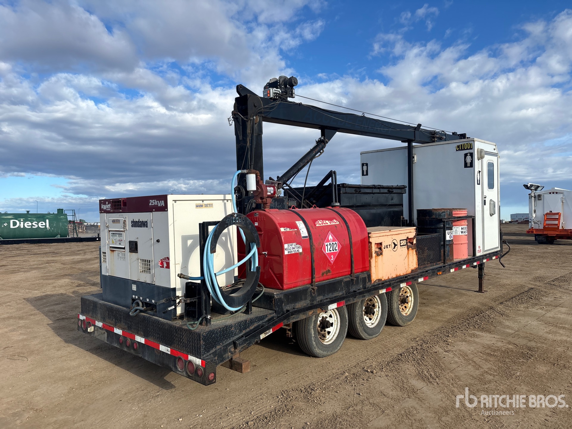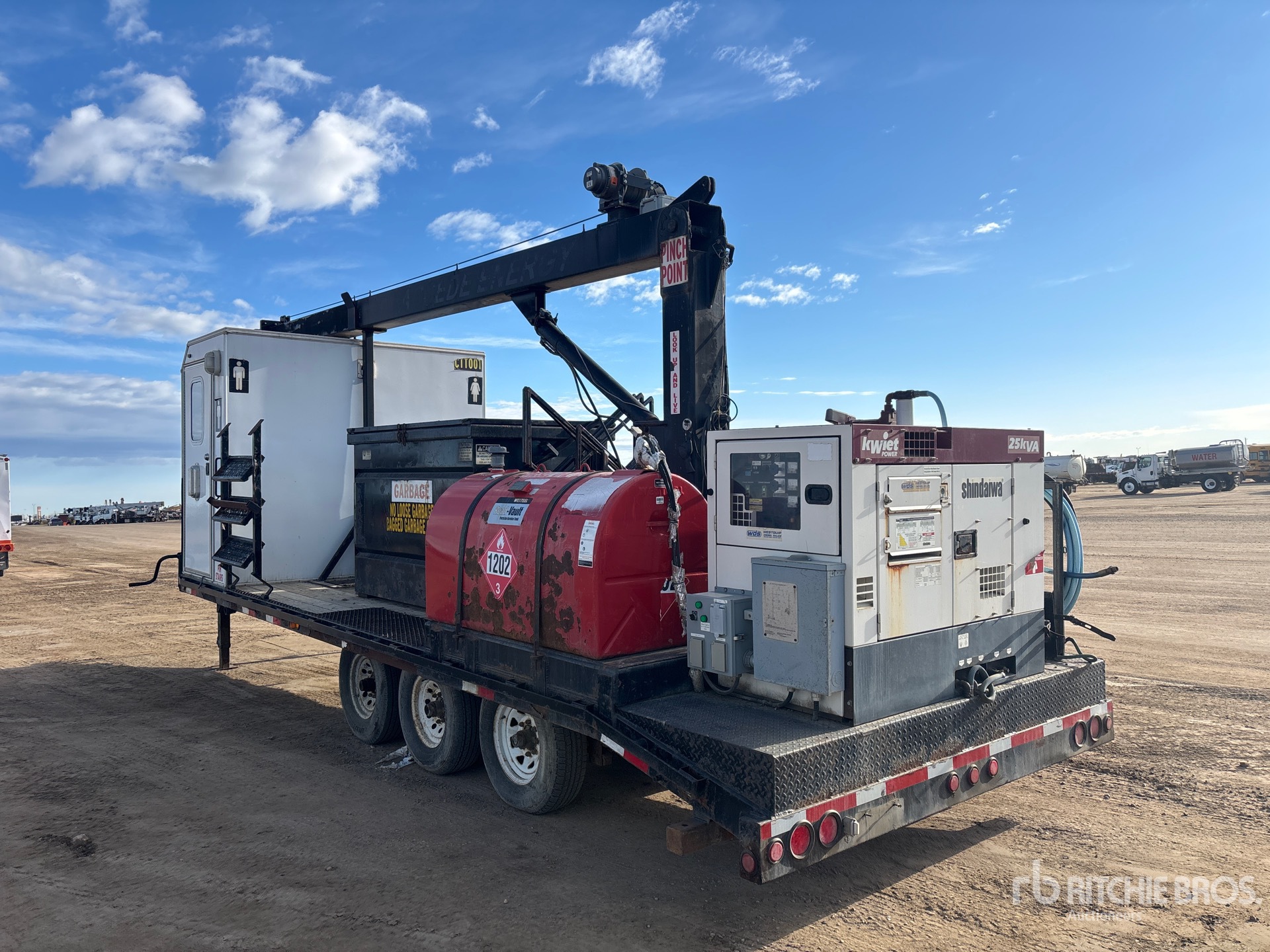 Shindaiwa SSG-3025DI 25 kVA Main Generator, ( 5 ) Lamp LED Light Tower Mast, (2) Washrooms, 750 L Generator Fuel Tank, 750 L Auxiliary Fuel Tank, Waste Bin, Tri/A Lunette Ring Trailer, Electric Brakes