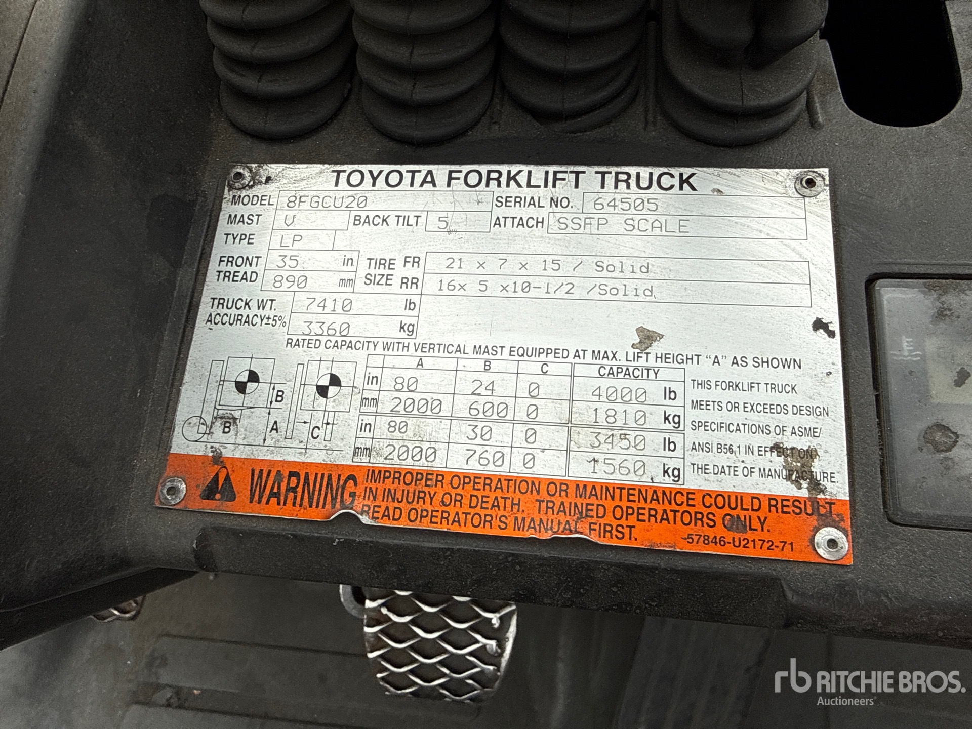 2 Stage Mast, 80 in Max Lift Height, 57 in Lowered Mast Height, 41 in Forks, Side Shift, Fork Positioner, Load Weigh System, 2014 US EPA Label, Toyota 4Y ECS 4 Cylinder 2.2 L LPG Engine