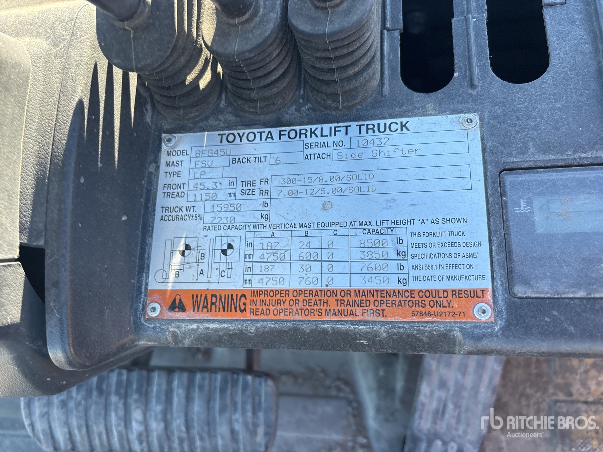 3 Stage Mast, 187 in Max Lift Height, 89 in Lowered Mast Height, 47 in Forks, Side Shift, Fork Positioner, 2015 US EPA Label, Toyota 4 Cylinder 3.6 L LPG Engine
