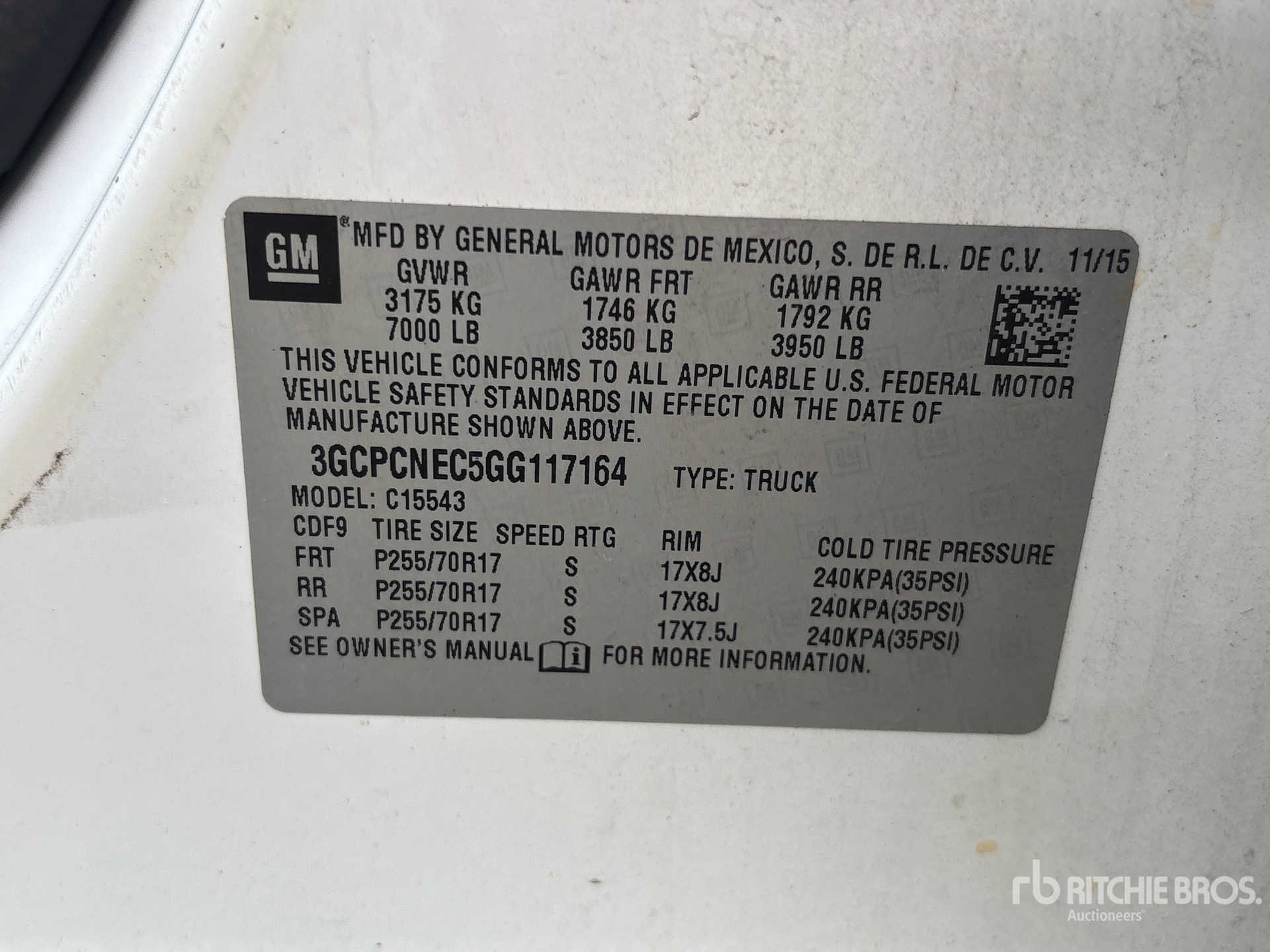 5.3 L V8 Gasoline Engine, 2016 US EPA Label, Automatic Transmission, Air Conditioner, Power Windows, Spray-On Bed Liner, 7000 lb GVWR, 265/65R18 Tires, 6 ft Bed