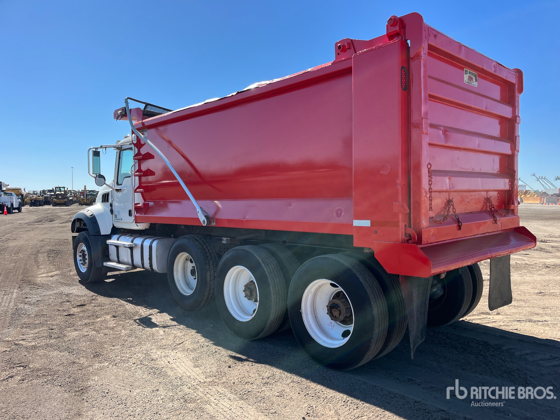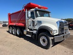 Located in Lane 58 Spot 11, Mack MP8 6 Cylinder Diesel 455 hp Engine, 2016 US EPA Label, Requires Diesel Exhaust Fluid, 18190 Engine hrs, Allison Automatic Transmission, 18000 lb Front Axle, 44000 lb Rears, 62000 lb GVWR, Aluminum Wheels, 385/65R22.5 Front Tires, 11R24.5 Rear Tires, Air Lift Pusher Axle, Camelback Suspension, 228 in Wheelbase, PTO, OX Bodies 16 ft Long x 4 ft High Steel Body, Round Bottom, Electric Roll Tarp