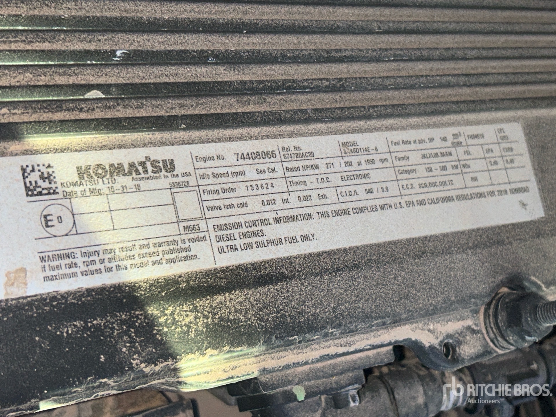 El informe detallado del equipo está limitado en su alcance y Ritchie Bros. Auctioneers no ha inspeccionado ningún aspecto o componente del equipo además de los que se especifican expresamente aquí. A menos que se diga expresamente, no efectuamos declaraciones ni otorgamos garantías, expresas o implícitas, concernientes al equipo o sus componentes, incluidas sin limitación cualesquiera declaraciones o garantías concernientes a la funcionalidad, la conformidad o el cumplimiento de cualquier estándar de seguridad o requerimiento de cualquier autoridad correspondiente u organismo normativo, adecuación para cualquier propósito en particular, o comercialización. Se le recomienda muy especialmente que realice su propia inspección detallada del equipo antes de ofertar.