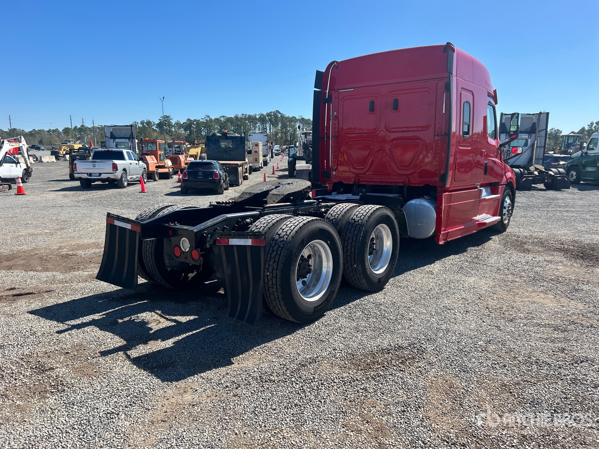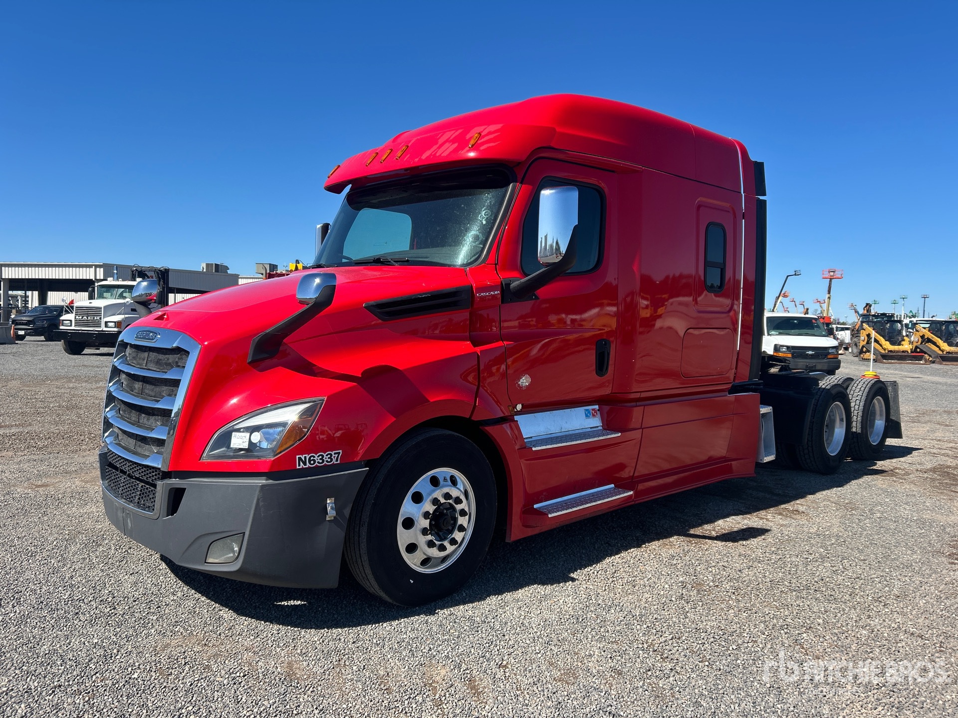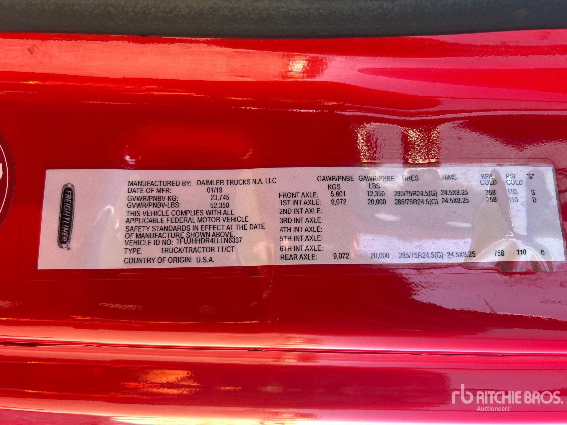Detroit DD15 455 hp Engine, 2019 US EPA Label, Eaton Fuller FRO-16210C 10-Speed Manual Transmission, 12350 lb Front Axle, 40000 lb Rears, 52350 lb GVWR, Engine Brake, Differential Lock, 70 in Mid Roof Sleeper Cab, 251 in Wheelbase, Air Suspension, Aluminum Wheels, 295/75R22.5 Front Tires, 295/75R22.5 Rear Tires, Air Sliding 5th Wheel, Dual Fuel Tanks