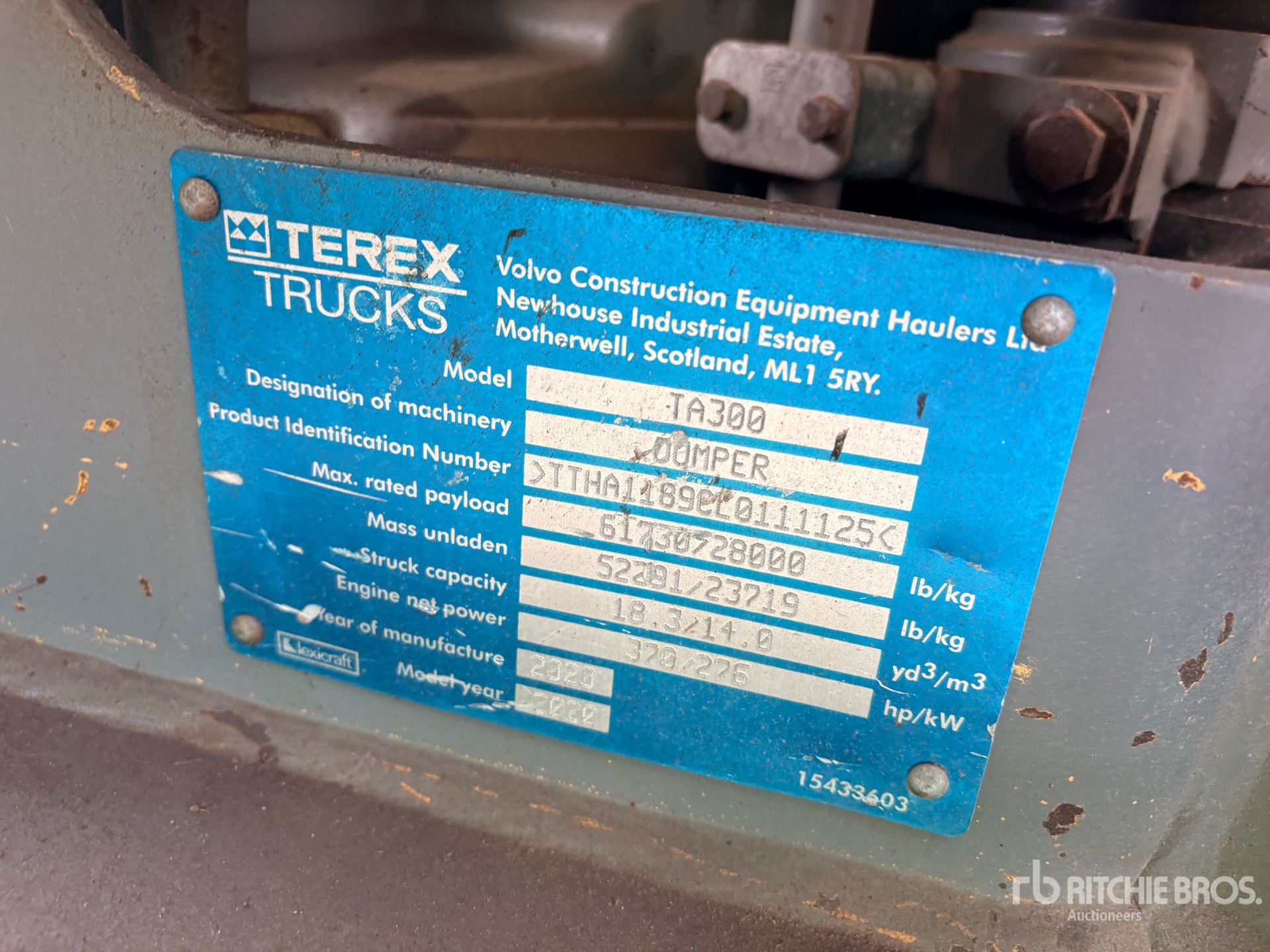 El informe detallado del equipo está limitado en su alcance y Ritchie Bros. Auctioneers no ha inspeccionado ningún aspecto o componente del equipo además de los que se especifican expresamente aquí. A menos que se diga expresamente, no efectuamos declaraciones ni otorgamos garantías, expresas o implícitas, concernientes al equipo o sus componentes, incluidas sin limitación cualesquiera declaraciones o garantías concernientes a la funcionalidad, la conformidad o el cumplimiento de cualquier estándar de seguridad o requerimiento de cualquier autoridad correspondiente u organismo normativo, adecuación para cualquier propósito en particular, o comercialización. Se le recomienda muy especialmente que realice su propia inspección detallada del equipo antes de ofertar.