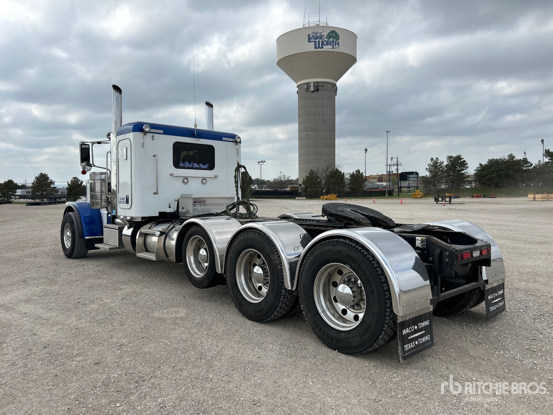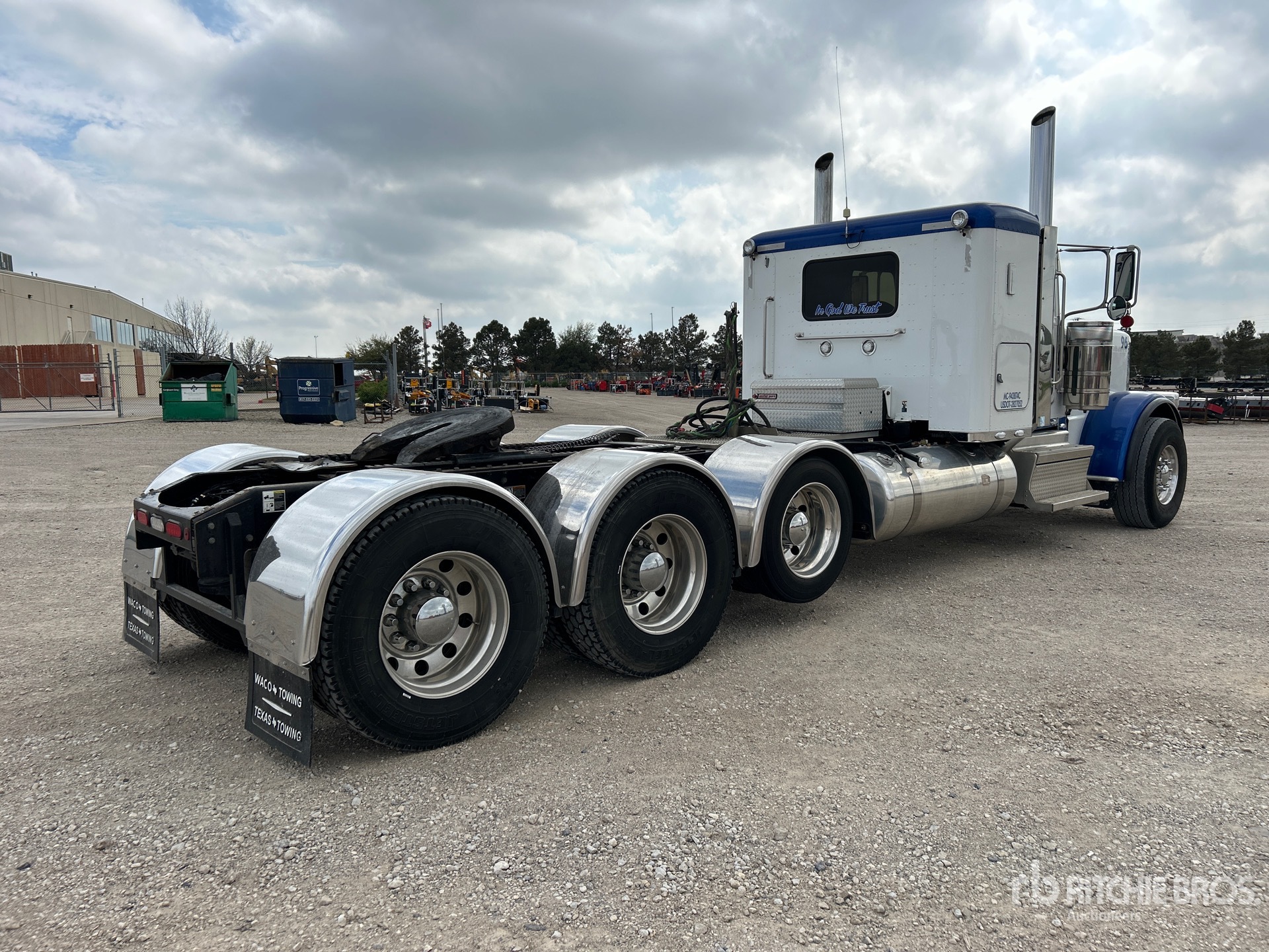 Cummins X15 605 hp Engine, US EPA Label, 10560 Engine hrs, Eaton Fuller RTLO-18918B 18-Speed Manual Transmission, 20000 lb Front Axle, 65680 lb Rears, 80000 lb GVWR, Engine Brake, 48 in Flat Top Sleeper Cab, 268 in Wheelbase, Air Suspension, Air Lift Pusher Axle, Aluminum Wheels, 425/65R22.5 Front Tires, 11R24.5 Rear Tires, Dual Steering Boxes, Double Frame, Wet Kit, Air Sliding 5th Wheel, Dual Fuel Tanks, Headache Rack, Equipment-from-Waco-Towing