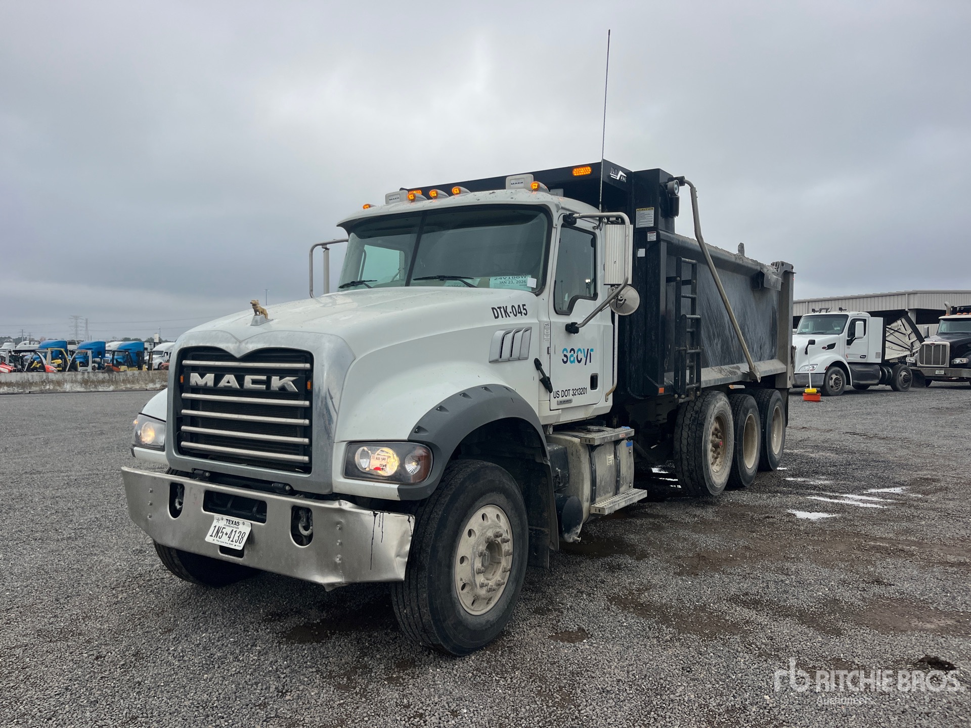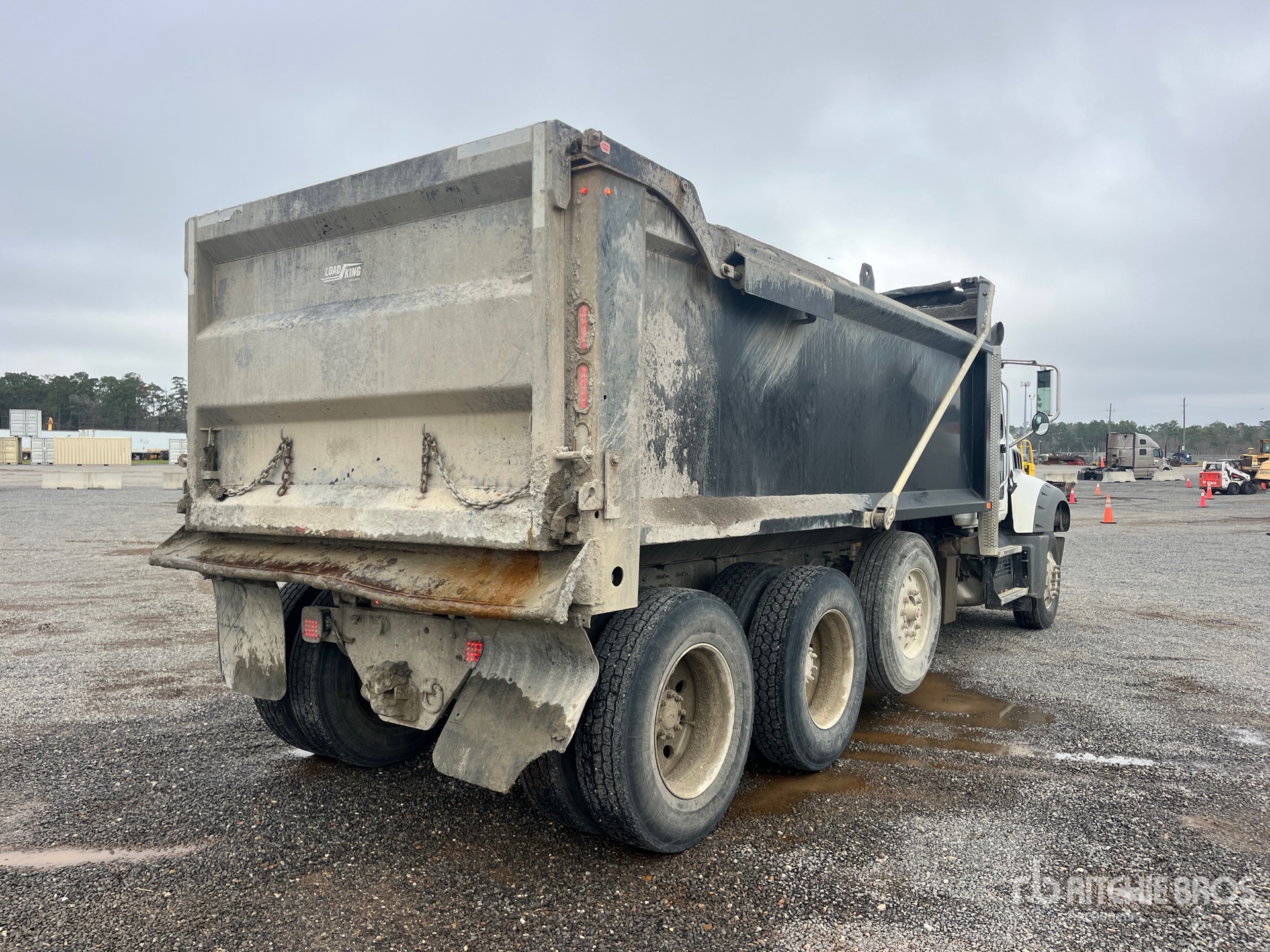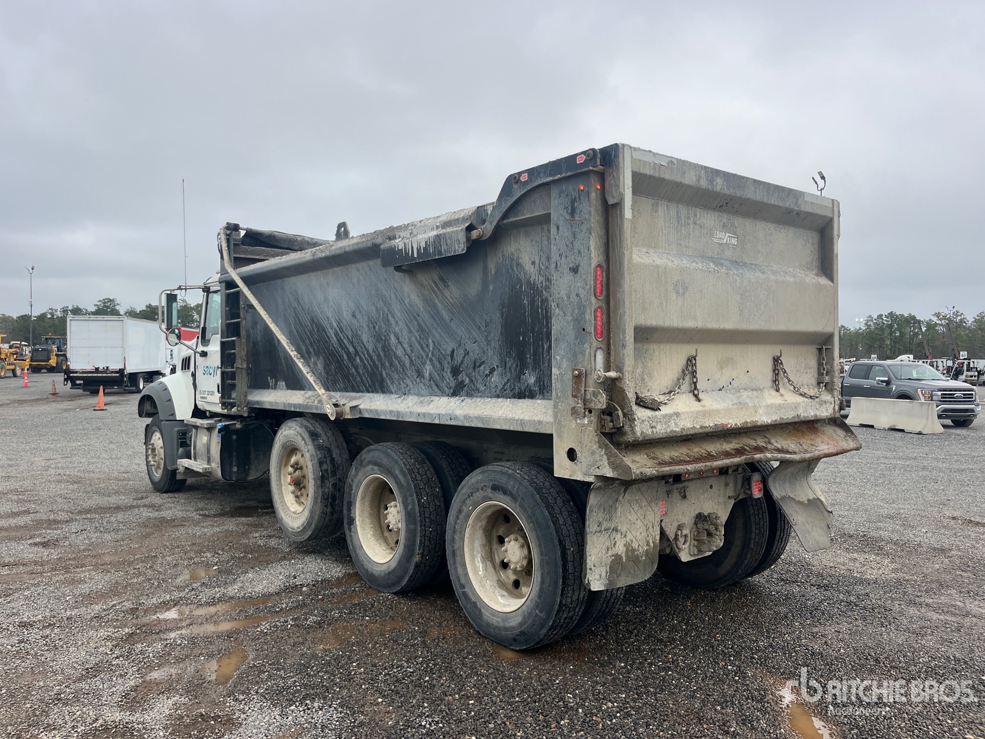 Mack MP8 12.8 L Diesel 505 hp Engine, 2022 US EPA Label, Requires Diesel Exhaust Fluid, 3361 Engine hrs, Mack mDrive Automated Transmission, 20000 lb Front Axle, 46000 lb Rears, 86000 lb GVWR, Aluminum Wheels, 315/80R22.5 Front Tires, 11R24.5 Rear Tires, Steerable Air Lift Pusher Axle, Hendrickson Haulmaax Suspension, 255 in Wheelbase, Load King 16 ft Long x 5 ft High Steel Body, Electric Roll Tarp, Ringfeder