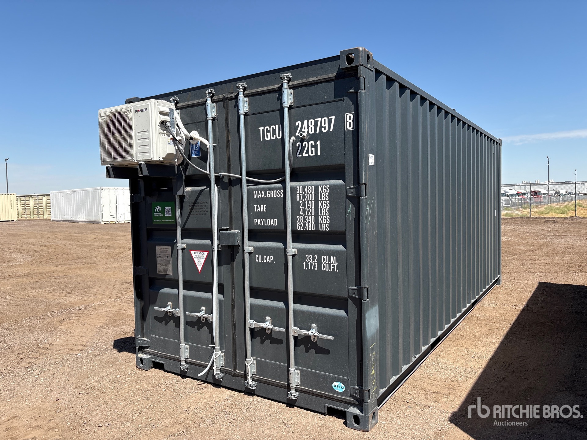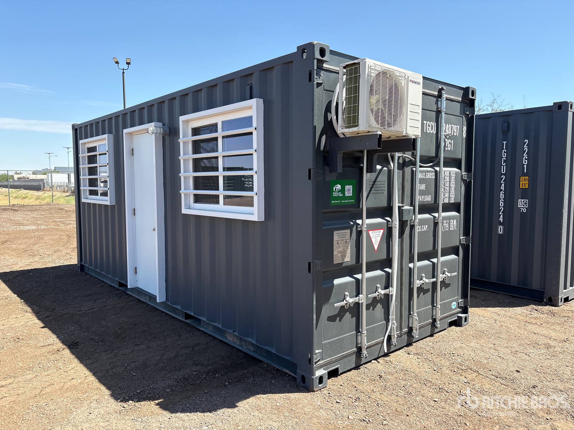 20' x 8', 8' 6" High, (1) Swing-Out Door, (2) Windows w/Security Bars, Fork Pockets, Laminate Flooring, SunScreen, R13 Insulation, (1) Pioneer HVAC Mini-Split, (1) Electric Panel, LED Ceiling Lights, Interior Outlets, Wiring done to National Electric Code (NEC)