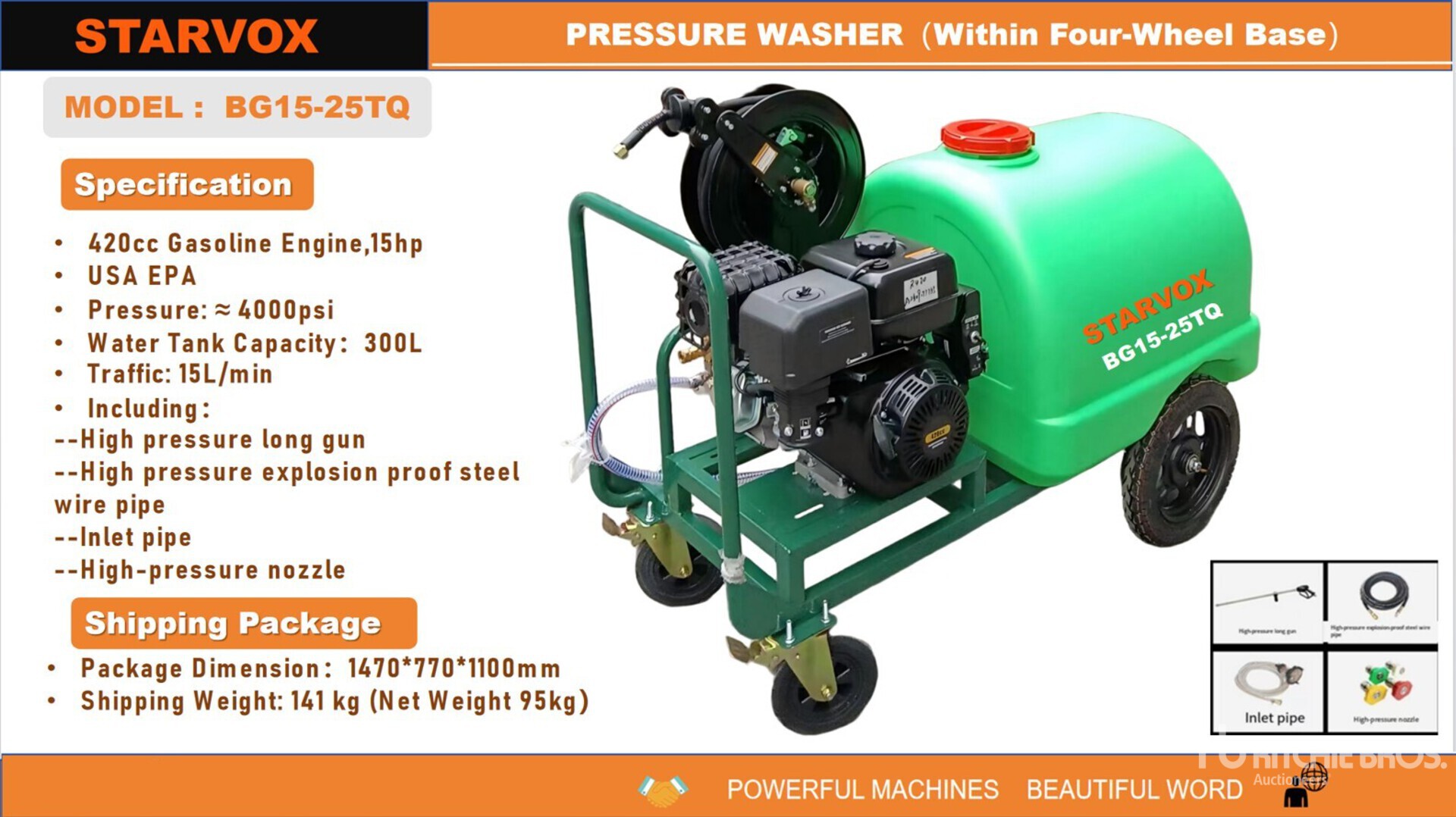 4000 psi Rating, 79 gal Water Supply, Hose, Spray Wand, 1 Cylinder 15 hp 420 cc Gasoline Engine, Product images displayed are stock photos. Item is new/unused.