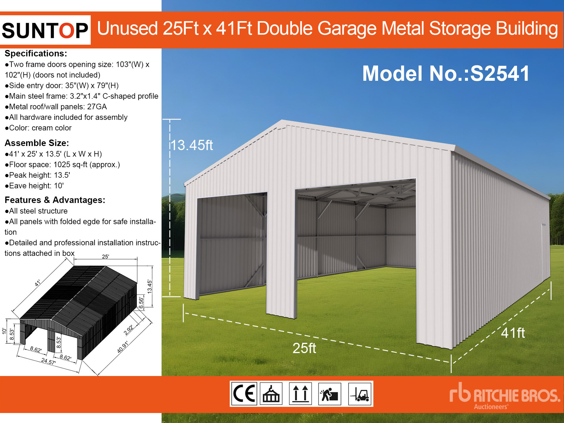 Las mediciones se expresan de modo estimativo solamente. Las dimensiones reales de la carga pueden variar según la altura del camión o remolque y la posición o configuración de la máquina cargada. Es responsabilidad del comprador calcular las dimensiones de las cargas antes de abandonar nuestro sitio de subastas a fin de garantizar que aquellas se pueden transportar de modo seguro. El comprador deberá verificar todas las dimensiones. No confíe en estas dimensiones para fines de transporte.
