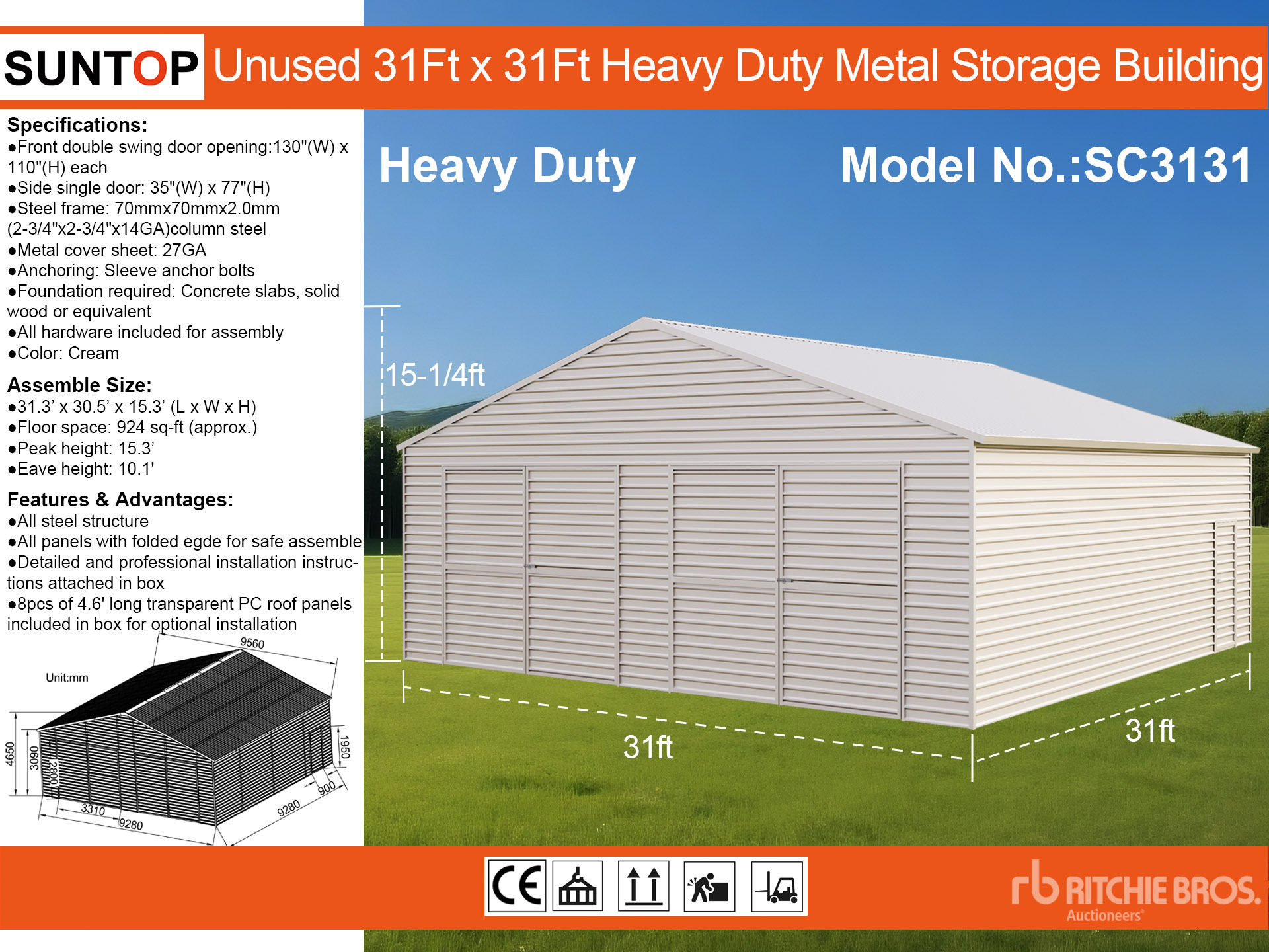 Las mediciones se expresan de modo estimativo solamente. Las dimensiones reales de la carga pueden variar según la altura del camión o remolque y la posición o configuración de la máquina cargada. Es responsabilidad del comprador calcular las dimensiones de las cargas antes de abandonar nuestro sitio de subastas a fin de garantizar que aquellas se pueden transportar de modo seguro. El comprador deberá verificar todas las dimensiones. No confíe en estas dimensiones para fines de transporte.