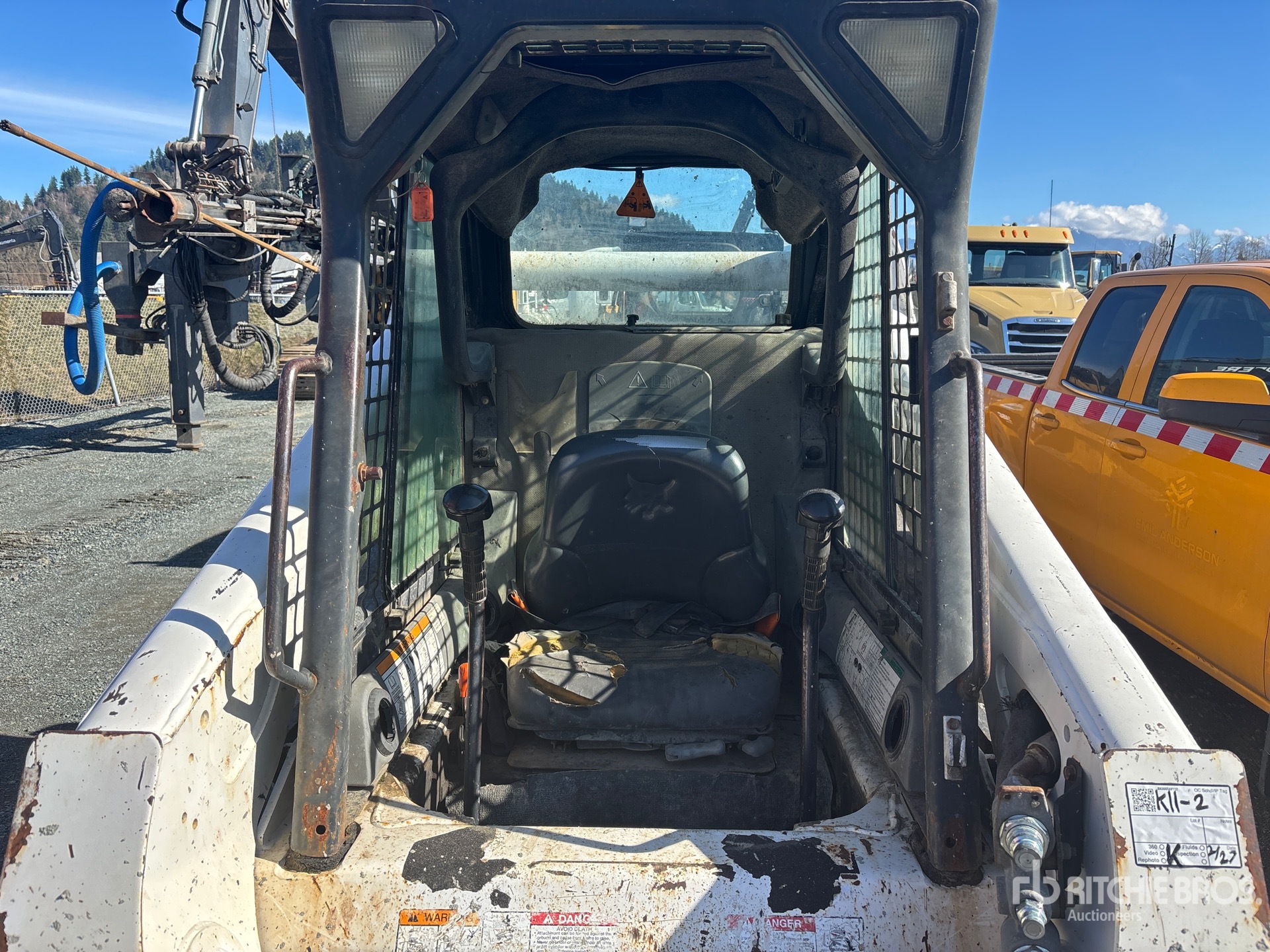 Enclosed Cab (Door missing), 17.5 in Track Belts, Hydraulic Coupler, 84 in Bucket