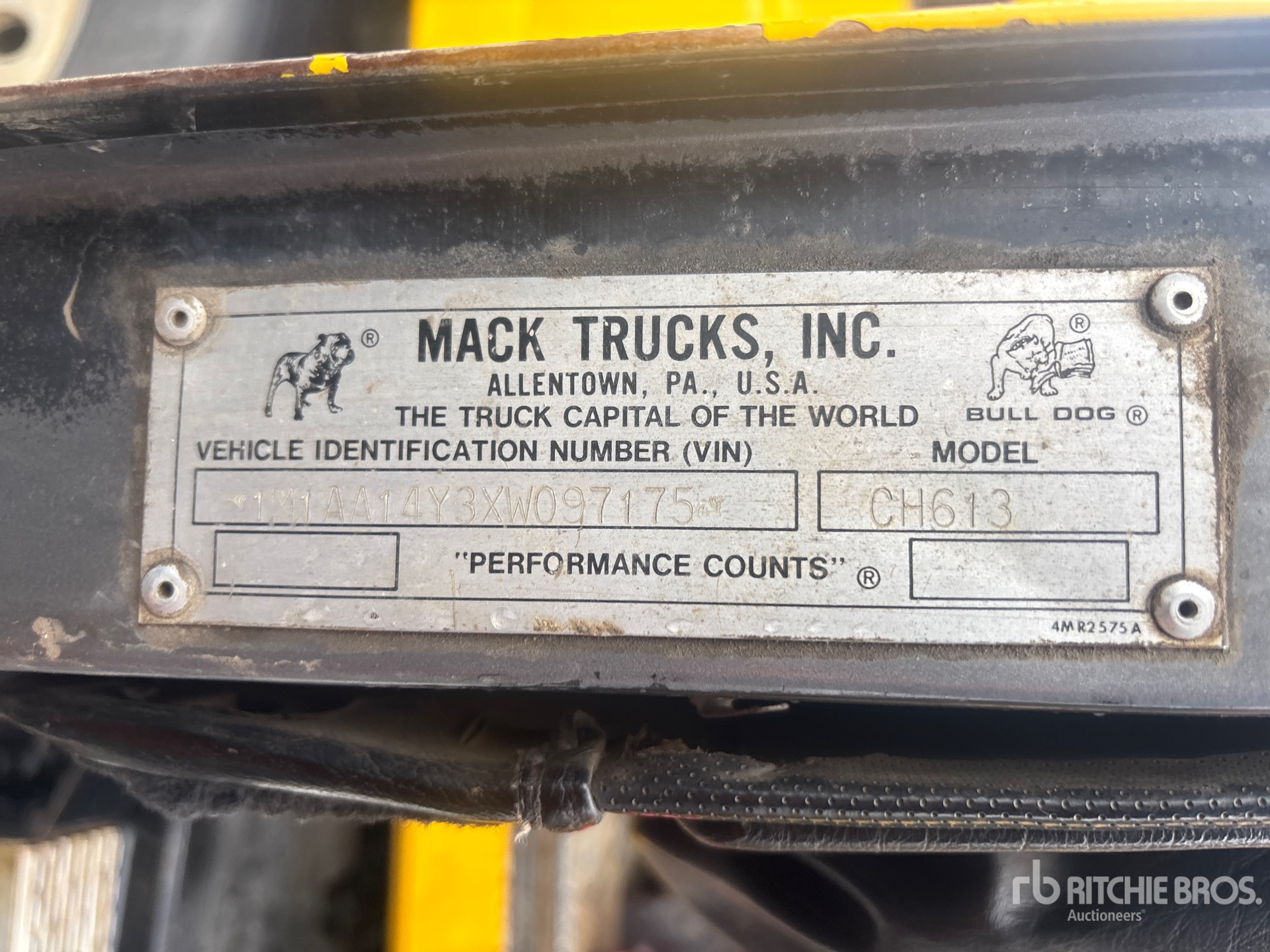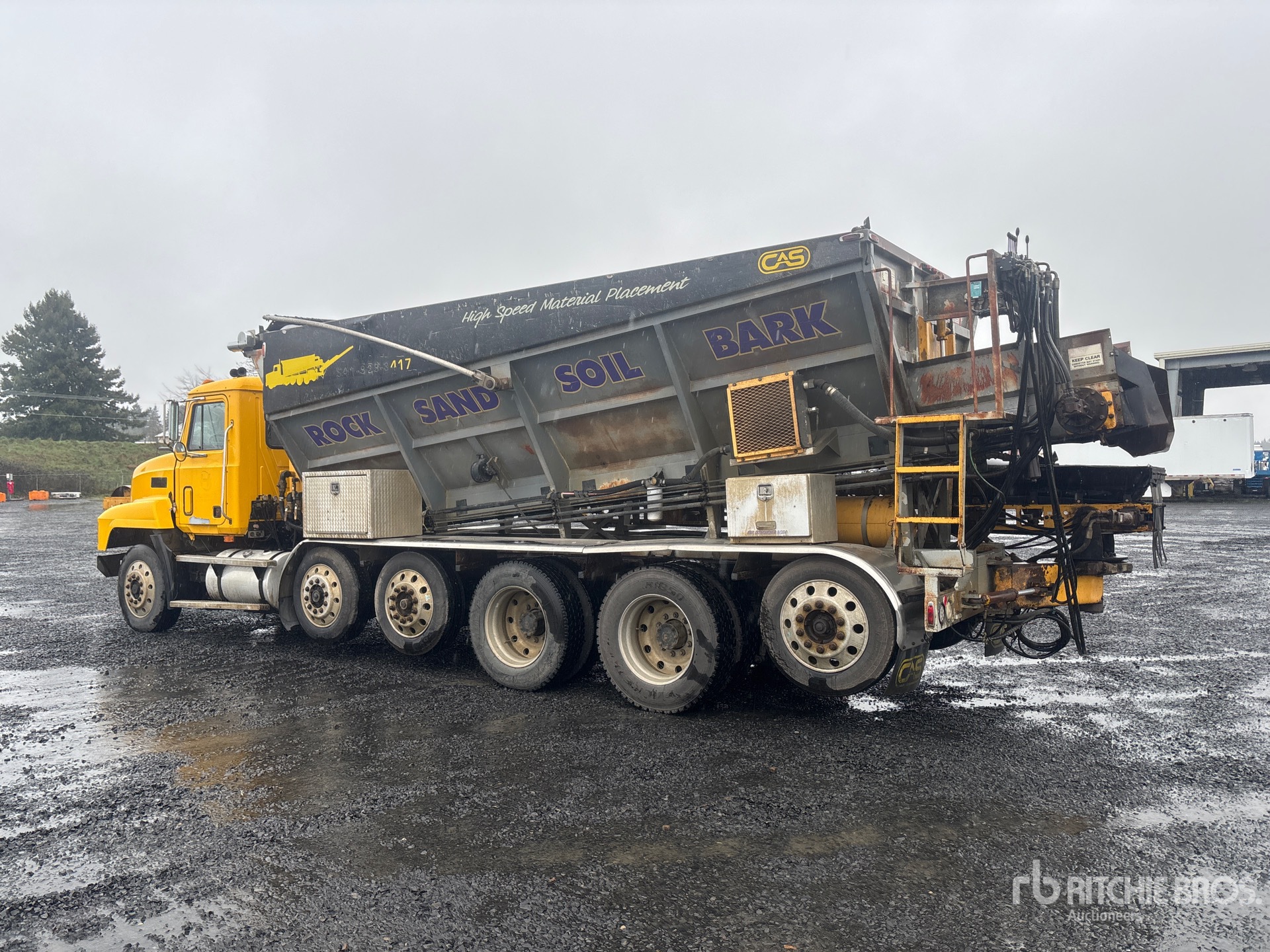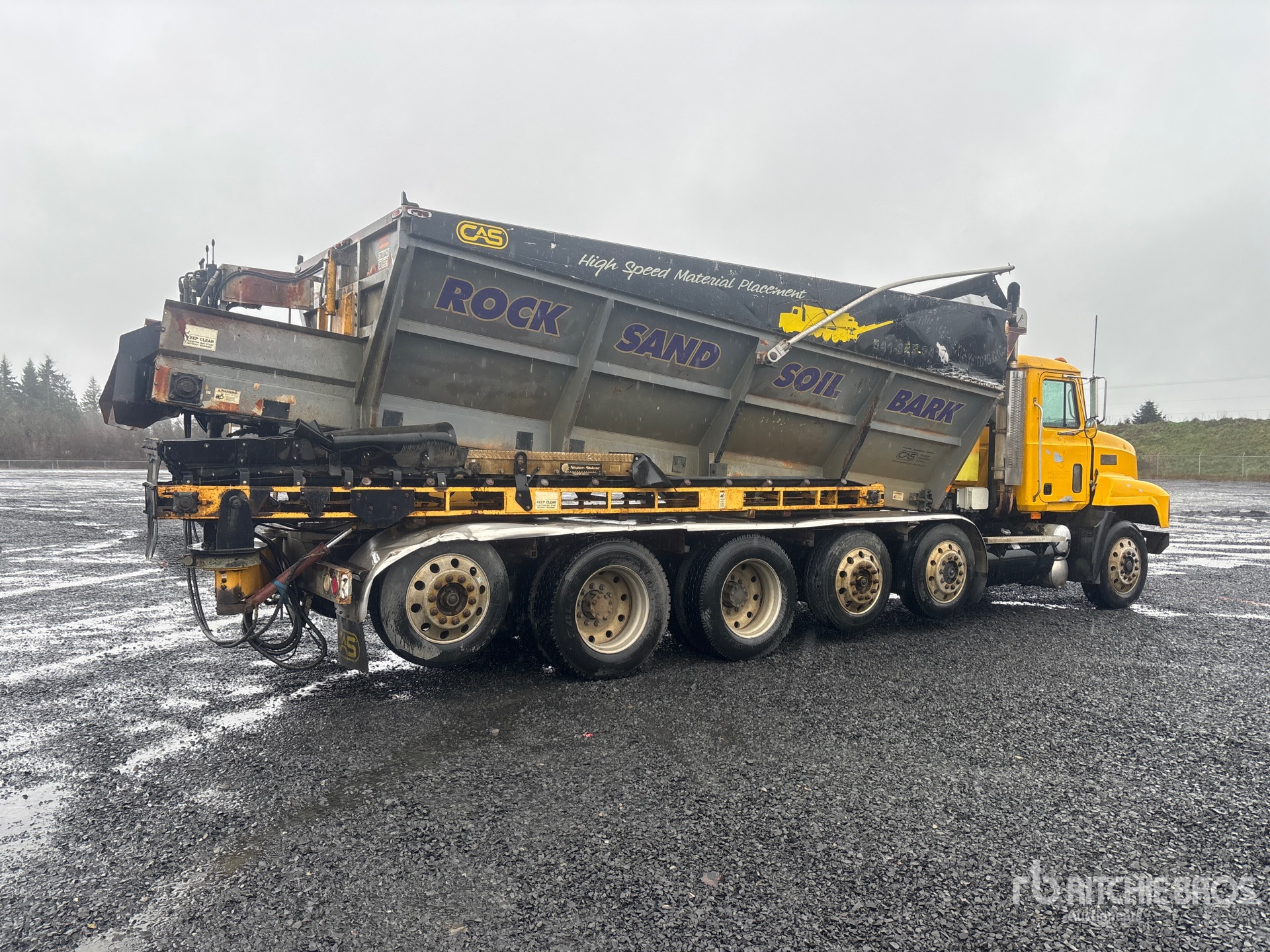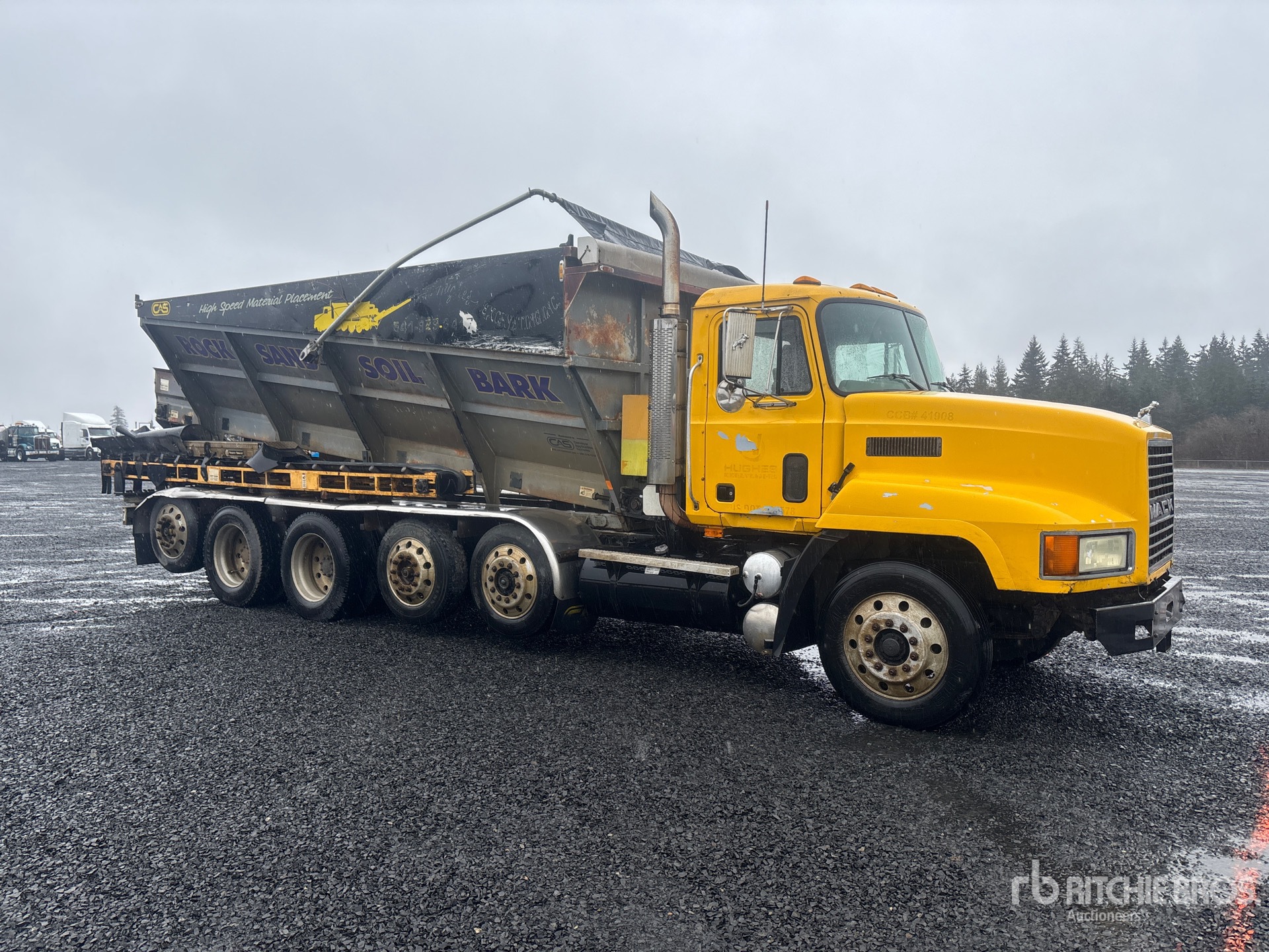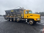 Located in Lane 9 Spot 21, Mack E7 6 Cylinder Diesel 400 hp Engine, 1997 US EPA Label, 28367 Engine hrs, Engine Brake, Eaton Fuller 10-Speed Manual Transmission, Air Ride Cab, Aluminum Outer Wheels, 285/75R24.5, 2 Steerable Air Lift Pusher Axle, Air Lift Tag Axle, Air Ride Suspension, 216 in Wheelbase, PTO, 14 in x 18 ft 6 in Conveyor, Cordless Remote Control