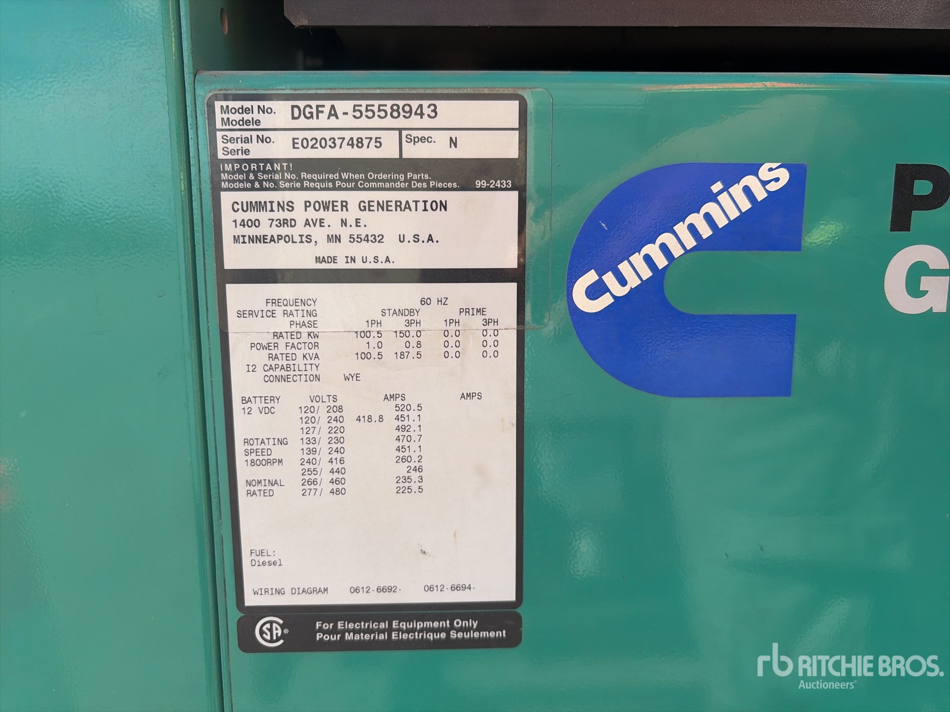 2002 US EPA Label, Cummins 6CTA8.3-G2 6 Cylinder 252 hp 8.3 L Diesel Engine, 187.5 kVA/150.5 kW Rated 3 Phase Output, / 480 V Rated Voltage, 100.5 kVA,/100.5 kW, Rated Single Phase Output, 120 V / 240 V Rated Voltage
