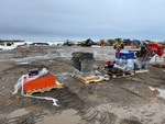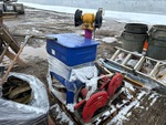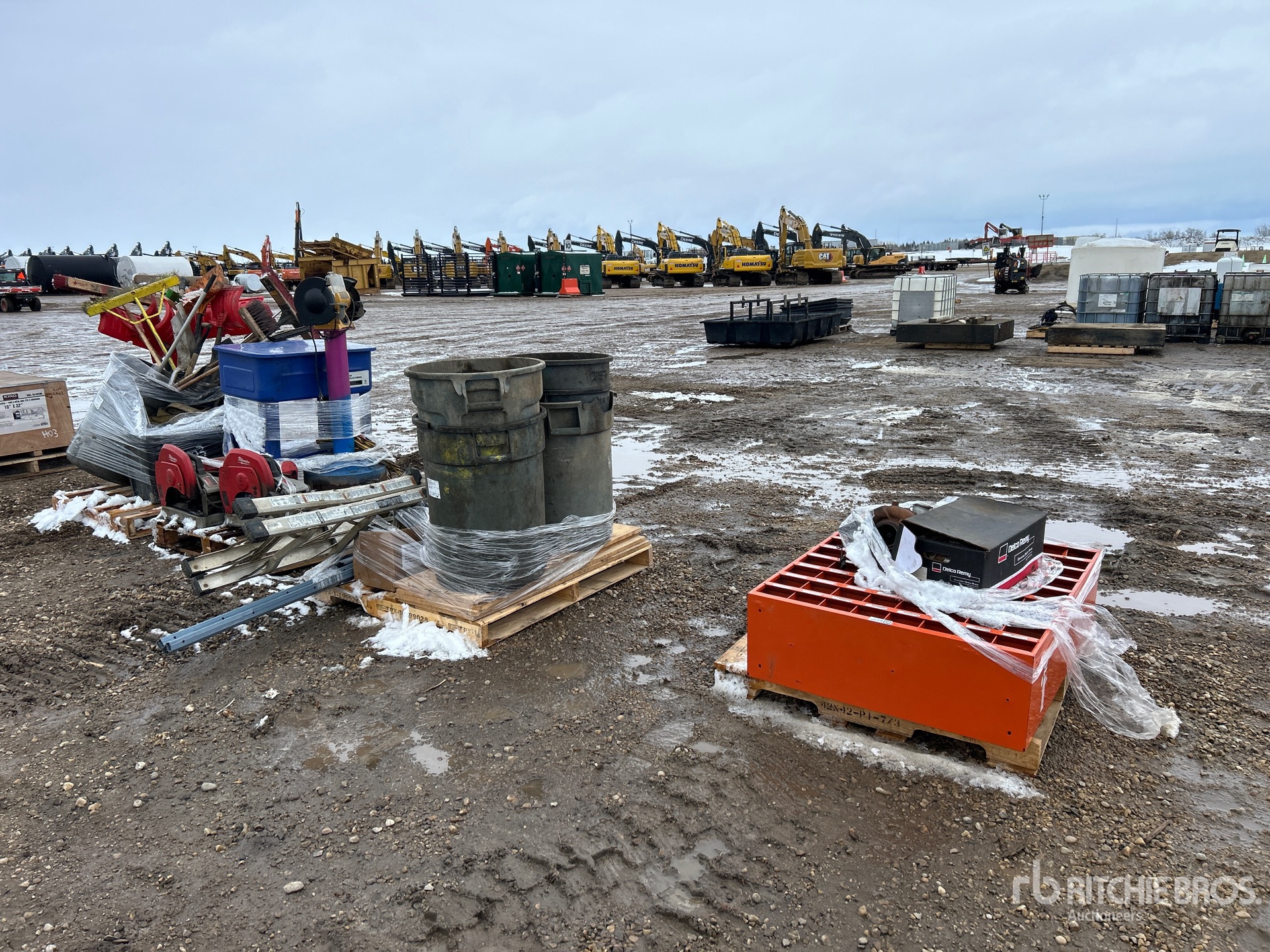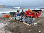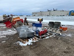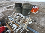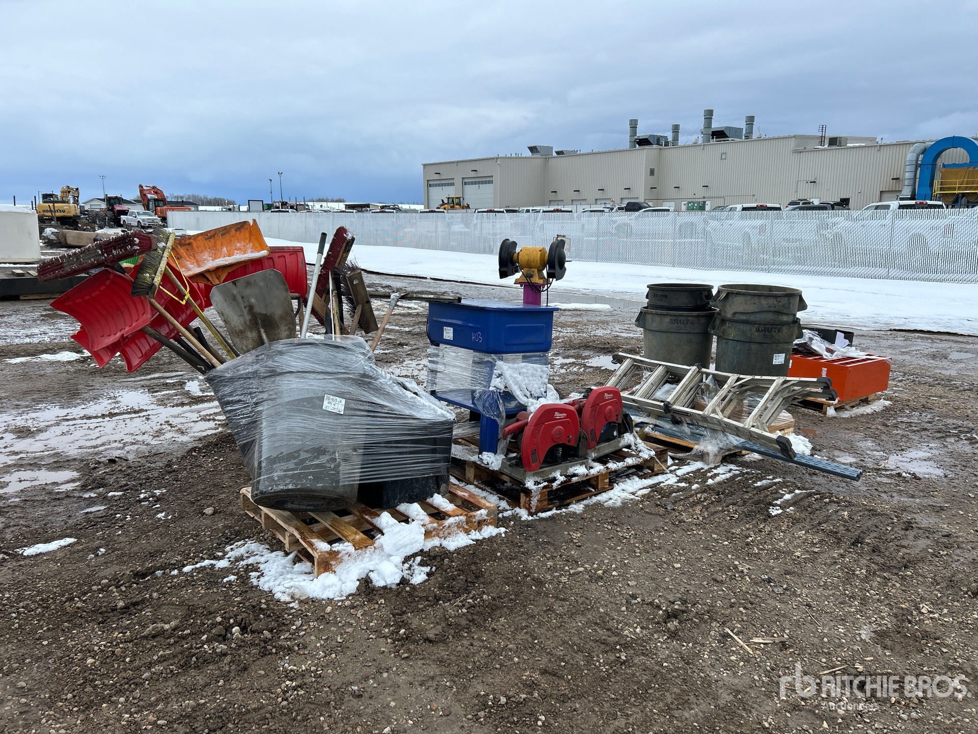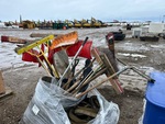 Parts washer, Milwaukee cutoff saws, grinder w/ stand, ladder, bolt bin, brooms, shovels